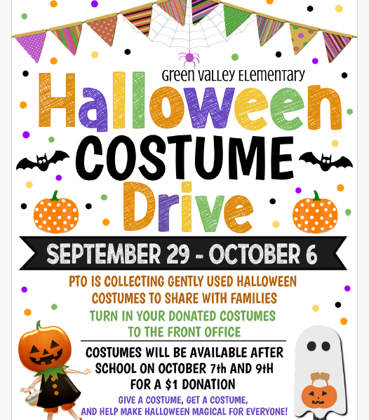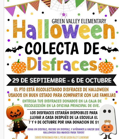 Estimadas familias: ¡Tenemos una emocionante campaña para recaudar fondos: Donaciones de disfraces! La Asociación de Padres y Maestros (PTO) está recolectando disfraces de Halloween usados ​​en buen estado para compartir con las familias. Por favor, entreguen los disfraces donados en la oficina principal. Los disfraces estarán disponibles después de clases los días 7 y 9 de octubre por una donación de $1. ¡Regale un disfraz, reciba un disfraz y ayude a que Halloween sea mágico para todos! Este evento está orgullosamente patrocinado por la Asociación de Padres y Maestros (PTO) de la Escuela Primaria Green Valley. ¡Gracias por su apoyo!