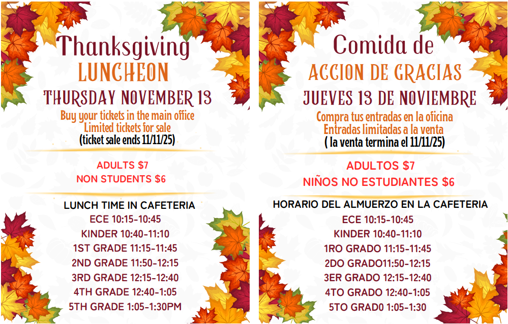 Hola queridas familias, ¡Nuestra comida de Acción de Gracias ya se acerca ! Las entradas salen a la venta mañana, 11/21/25 ¡no se lo pierdan! ¡Gracias! La venta de boletos termina el 11/11/25