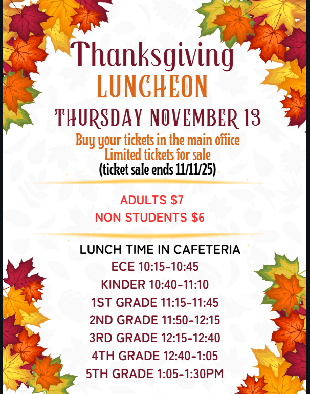 Hola queridas familias, ¡Nuestra comida de Acción de Gracias ya se acerca ! Las entradas salen a la venta mañana, 11/21/25 ¡no se lo pierdan! ¡Gracias! La venta de boletos termina el 11/11/25