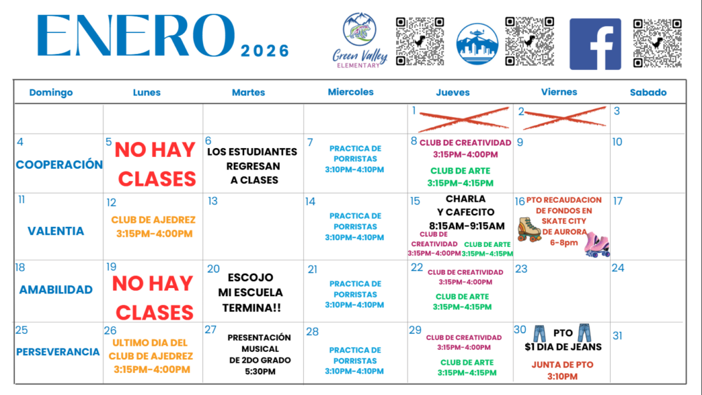 Por favor, anoten en sus calendarios las fechas y actividades importantes de Enero de 2026: