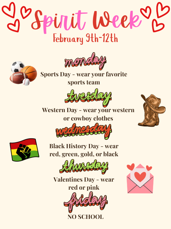 Spirit Week is coming Feb. 9–12 and we’d love for your student to join the fun! Themes were chosen by Student Council.